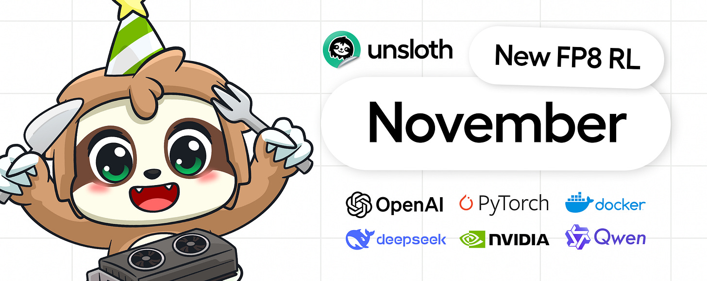 We’re getting close to our final release of 2025! Thanks so much for sticking with us this year. We’ve got lots of new features like FP8 RL and collabs with OpenAI, NVIDIA and more! See below for our latest updates: